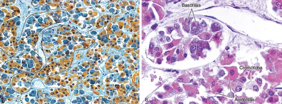 Pars distalis da adeno-hipófise. A. Na pars distalis, as células endócrinas são organizadas em cordões ou ilhas. Dois desses cordões estão assinalados. As células acidófilas estão coradas em castanho e as basófilas, em azul. (Fotomicrografia. Tricrômico de Mallory. Pequeno aumento.) B. Alguns corantes permitem uma distinção melhor dos grãos de secreção das células cromófilas (acidófilas e basófilas) da pars distalis. Observe dois capilares sanguíneos: em cima, à esquerda, e embaixo, à direita. (Fotomicrografia. Tricrômico de Gomori. Grande aumento.)