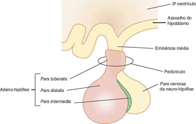 A glândula hipófise é uma estrutura ovóide (cerca de 12 mm de diâmetro transversal e 8 mm de diâmetro anteroposterior, e com um peso médio de 500 mg no adulto), é contínua com o infundíbulo, um prolongamento inferior oco, de formato cônico, derivado do túber cinéreo do hipotálamo.