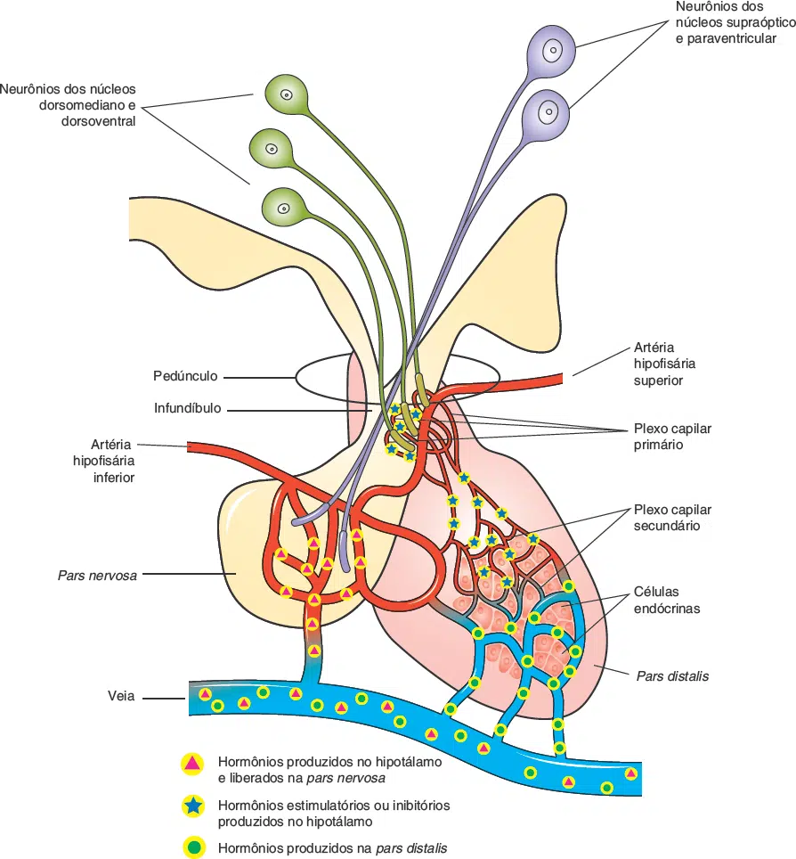 Esse plexo capilar primário é drenado pelas veias porta-hipofisários, em direção ao plexo capilar secundário, que está localizado em torno da adeno-hipófise, desta forma, os hormônios liberadores do hipotálamo alcançam os trofos da parte distal da hipófise, controlando sua secreção.
